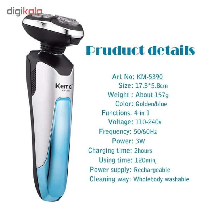 ماشین اصلاح کیمی مدل KM-5390 ازجمله دستگاههای حرفهای کیمی است که به دلیل قابلیت چهار کاره بودن از محبوبیت بالایی بین مصرف کنندگان برخوردار است که سری اصلی آن از جنس استیل ضد زنگ است و دارای تکنولوژی اصلاح برش چرخشی با انعطاف بالا می باشد که ضخیمترین و ریزترین موها را به دام می اندازد و در صورتی که موها بلندتر باشد میتوان از طریق سری مخصوص که بر روی دستگاه سوار میشود برای کوتاه کردن استفاده کرد. با سری خط زن این دستگاه که یک سری کامل است میتوان برای اصلاح خط ریش و سبیل استفاده کرد. سری دیگر این دستگاه برای اصلاح مو های گوش و بینی است و دیگر سری این دستگاه که در کمتر دستگاهی است و بسیار برای پوست مناسب است سری پاکسازی است که کاملا پوست را تمیز کرده و بعد از اصلاح به پوست شادابی می بخشد. از دیگر نقاط مثبت دستگاه مجهز بودن به باتری لیتیوم یون قابل شارژمیباشد که با دو ساعت استفاده 120دقیقه قابل استفاده است خوشبختانه این محصول از سیستم شارژ سریع بهره میبرد که با 10دقیقه شارژامکان یک بار اصلاح برای شما فراهم میشود. این دستگاه دارای عملکرد قفل مسافرتی است که دکمه پاور را 3 دقیقه فشار دهید وارد حالت قفل مسافرتی شده که مانع از روشن شدن دستگاه به طور تصادفی می شود. از آنجایی که دستگاه کاملا ضد آب می باشد میتوان زیر دوش و به صورت خشک و مرطوب استفاده کرد .همچنین دستگاه دارای صفحه نمایش میباشد که در حین کار از میزان شارژ باقیمانده مطلع خواهیم شد..نا گفته نماند این محصول علاوه بر طراحی شیک و ساده دارای وزنی ایده آل است لذا مانع خستگی دستها می شود.ماشین اصلاح کیمی مدل KM-5390 ازجمله دستگاههای حرفهای کیمی است که به دلیل قابلیت چهار کاره بودن از محبوبیت بالایی بین مصرف کنندگان برخوردار است که سری اصلی آن از جنس استیل ضد زنگ است و دارای تکنولوژی اصلاح برش چرخشی با انعطاف بالا می باشد که ضخیمترین و ریزترین موها را به دام می اندازد و در صورتی که موها بلندتر باشد میتوان از طریق سری مخصوص که بر روی دستگاه سوار میشود برای کوتاه کردن استفاده کرد. با سری خط زن این دستگاه که یک سری کامل است میتوان برای اصلاح خط ریش و سبیل استفاده کرد. سری دیگر این دستگاه برای اصلاح مو های گوش و بینی است و دیگر سری این دستگاه که در کمتر دستگاهی است و بسیار برای پوست مناسب است سری پاکسازی است که کاملا پوست را تمیز کرده و بعد از اصلاح به پوست شادابی می بخشد. از دیگر نقاط مثبت دستگاه مجهز بودن به باتری لیتیوم یون قابل شارژمیباشد که با دو ساعت استفاده 120دقیقه قابل استفاده است خوشبختانه این محصول از سیستم شارژ سریع بهره میبرد که با 10دقیقه شارژامکان یک بار اصلاح برای شما فراهم میشود. این دستگاه دارای عملکرد قفل مسافرتی است که دکمه پاور را 3 دقیقه فشار دهید وارد حالت قفل مسافرتی شده که مانع از روشن شدن دستگاه به طور تصادفی می شود. از آنجایی که دستگاه کاملا ضد آب می باشد میتوان زیر دوش و به صورت خشک و مرطوب استفاده کرد .همچنین دستگاه دارای صفحه نمایش میباشد که در حین کار از میزان شارژ باقیمانده مطلع خواهیم شد..نا گفته نماند این محصول علاوه بر طراحی شیک و ساده دارای وزنی ایده آل است لذا مانع خستگی دستها می شود.