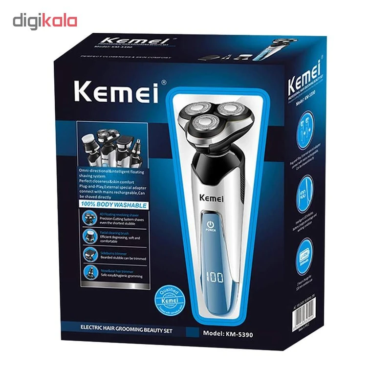 ماشین اصلاح کیمی مدل KM-5390 ازجمله دستگاههای حرفهای کیمی است که به دلیل قابلیت چهار کاره بودن از محبوبیت بالایی بین مصرف کنندگان برخوردار است که سری اصلی آن از جنس استیل ضد زنگ است و دارای تکنولوژی اصلاح برش چرخشی با انعطاف بالا می باشد که ضخیمترین و ریزترین موها را به دام می اندازد و در صورتی که موها بلندتر باشد میتوان از طریق سری مخصوص که بر روی دستگاه سوار میشود برای کوتاه کردن استفاده کرد. با سری خط زن این دستگاه که یک سری کامل است میتوان برای اصلاح خط ریش و سبیل استفاده کرد. سری دیگر این دستگاه برای اصلاح مو های گوش و بینی است و دیگر سری این دستگاه که در کمتر دستگاهی است و بسیار برای پوست مناسب است سری پاکسازی است که کاملا پوست را تمیز کرده و بعد از اصلاح به پوست شادابی می بخشد. از دیگر نقاط مثبت دستگاه مجهز بودن به باتری لیتیوم یون قابل شارژمیباشد که با دو ساعت استفاده 120دقیقه قابل استفاده است خوشبختانه این محصول از سیستم شارژ سریع بهره میبرد که با 10دقیقه شارژامکان یک بار اصلاح برای شما فراهم میشود. این دستگاه دارای عملکرد قفل مسافرتی است که دکمه پاور را 3 دقیقه فشار دهید وارد حالت قفل مسافرتی شده که مانع از روشن شدن دستگاه به طور تصادفی می شود. از آنجایی که دستگاه کاملا ضد آب می باشد میتوان زیر دوش و به صورت خشک و مرطوب استفاده کرد .همچنین دستگاه دارای صفحه نمایش میباشد که در حین کار از میزان شارژ باقیمانده مطلع خواهیم شد..نا گفته نماند این محصول علاوه بر طراحی شیک و ساده دارای وزنی ایده آل است لذا مانع خستگی دستها می شود.ماشین اصلاح کیمی مدل KM-5390 ازجمله دستگاههای حرفهای کیمی است که به دلیل قابلیت چهار کاره بودن از محبوبیت بالایی بین مصرف کنندگان برخوردار است که سری اصلی آن از جنس استیل ضد زنگ است و دارای تکنولوژی اصلاح برش چرخشی با انعطاف بالا می باشد که ضخیمترین و ریزترین موها را به دام می اندازد و در صورتی که موها بلندتر باشد میتوان از طریق سری مخصوص که بر روی دستگاه سوار میشود برای کوتاه کردن استفاده کرد. با سری خط زن این دستگاه که یک سری کامل است میتوان برای اصلاح خط ریش و سبیل استفاده کرد. سری دیگر این دستگاه برای اصلاح مو های گوش و بینی است و دیگر سری این دستگاه که در کمتر دستگاهی است و بسیار برای پوست مناسب است سری پاکسازی است که کاملا پوست را تمیز کرده و بعد از اصلاح به پوست شادابی می بخشد. از دیگر نقاط مثبت دستگاه مجهز بودن به باتری لیتیوم یون قابل شارژمیباشد که با دو ساعت استفاده 120دقیقه قابل استفاده است خوشبختانه این محصول از سیستم شارژ سریع بهره میبرد که با 10دقیقه شارژامکان یک بار اصلاح برای شما فراهم میشود. این دستگاه دارای عملکرد قفل مسافرتی است که دکمه پاور را 3 دقیقه فشار دهید وارد حالت قفل مسافرتی شده که مانع از روشن شدن دستگاه به طور تصادفی می شود. از آنجایی که دستگاه کاملا ضد آب می باشد میتوان زیر دوش و به صورت خشک و مرطوب استفاده کرد .همچنین دستگاه دارای صفحه نمایش میباشد که در حین کار از میزان شارژ باقیمانده مطلع خواهیم شد..نا گفته نماند این محصول علاوه بر طراحی شیک و ساده دارای وزنی ایده آل است لذا مانع خستگی دستها می شود.