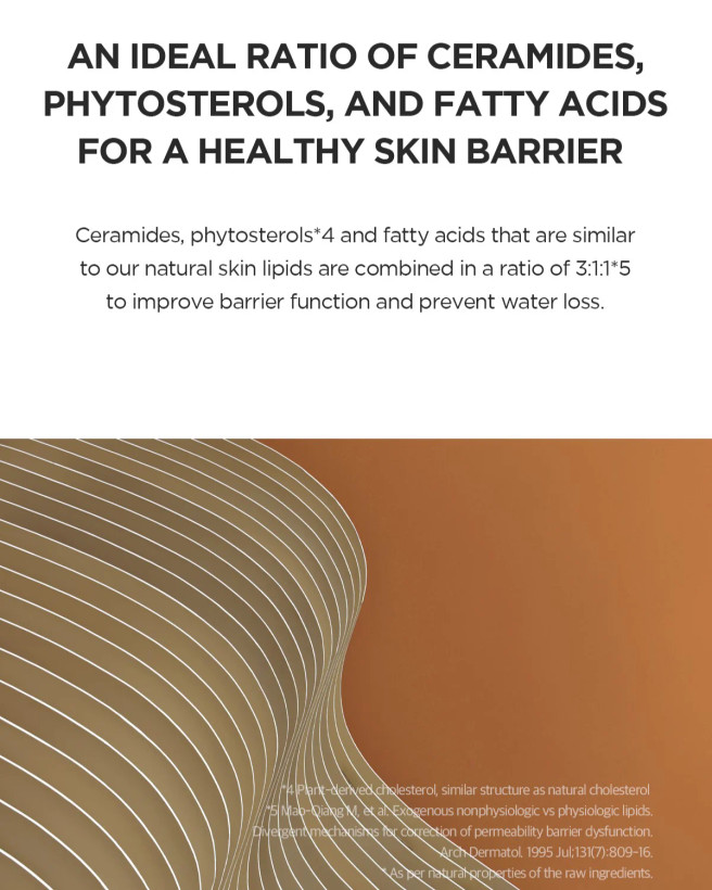 دارای نسبت طلایی سرامید، فیتوسترول و اسیدهای چرب (3:1:1) که به حفظ رطوبت پوست در طول روز کمک میکنند و باعث نرمی و درخشندگی پوست میشوند.