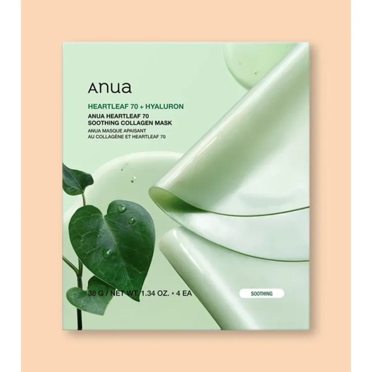 Anua Heartleaf 70 Soothing Collagen Mask یک ماسک ورقهای هیدروژلی فوقالعاده نازک است که با ترکیبی از ۷۰٪ عصاره هارتلیف، کلاژن با وزن مولکولی پایین ، به تسکین پوست، آبرسانی عمیق و بهبود بافت پوست کمک میکند. این ماسک با فناوری تغییر رنگ، پس از جذب کامل مواد مغذی، به ماسکی شفاف تبدیل میشود که نشاندهنده جذب کامل ترکیبات فعال است.